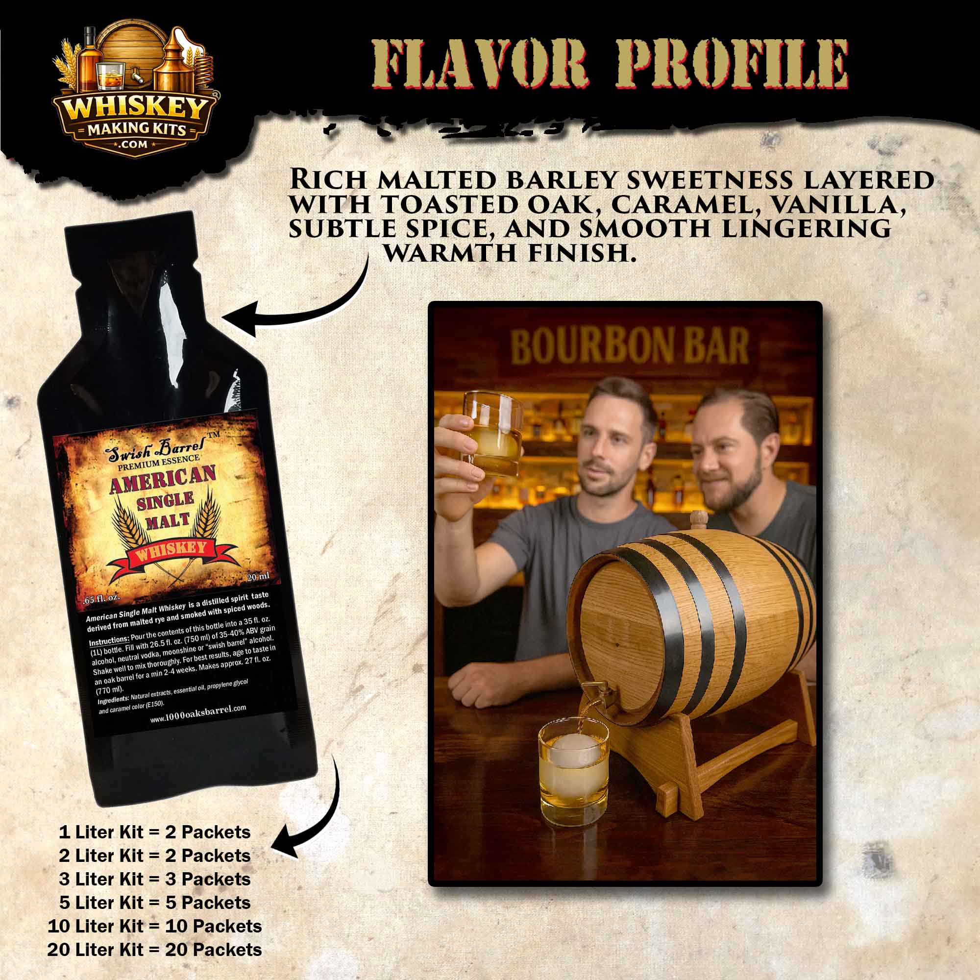 Experience the rich, malt-forward depth of American Single Malt Whiskey with this premium oak barrel aging kit. Designed for whiskey enthusiasts, home bartenders, and craft spirit lovers, this complete DIY whiskey aging kit allows you to create smooth, complex American-style single malt whiskey at home.