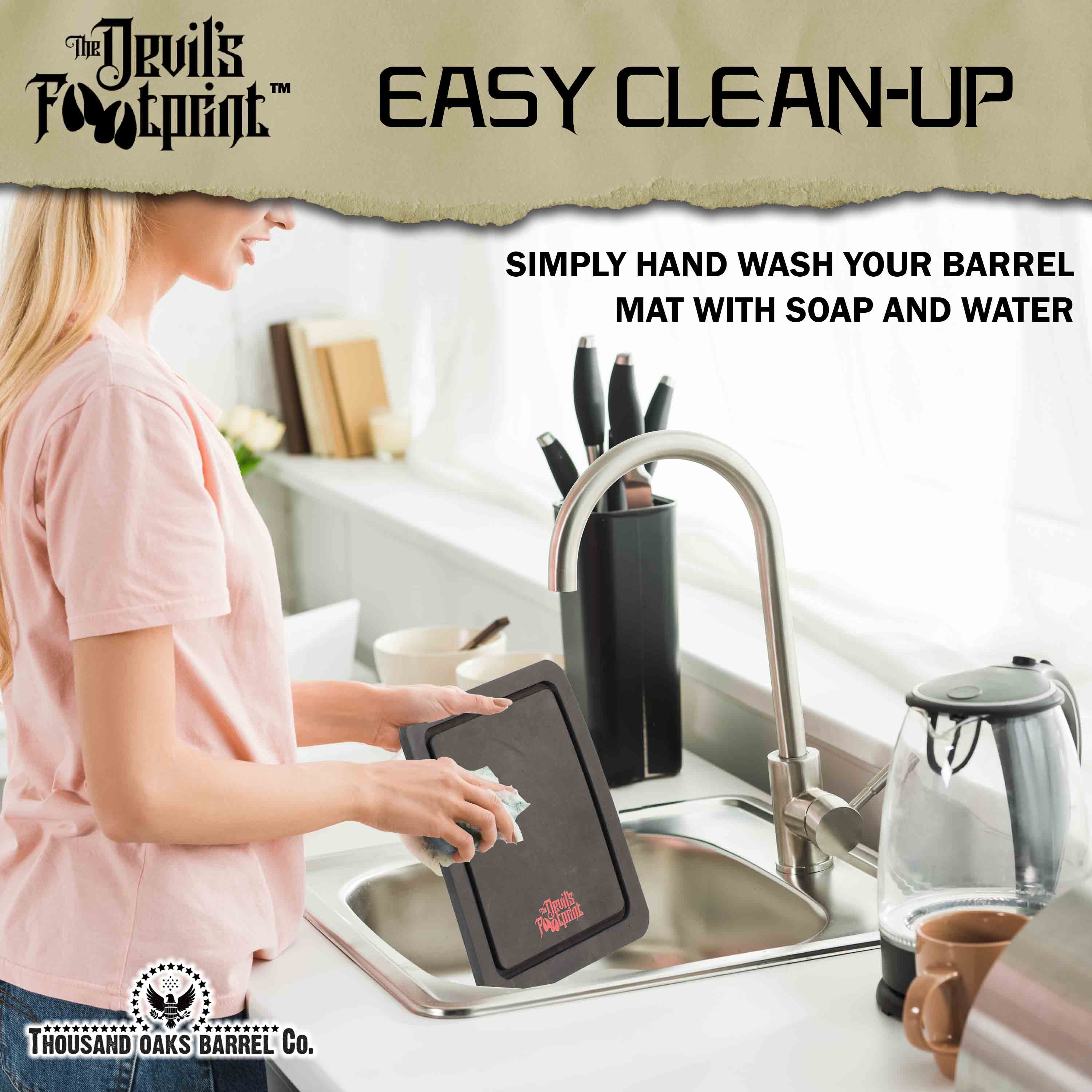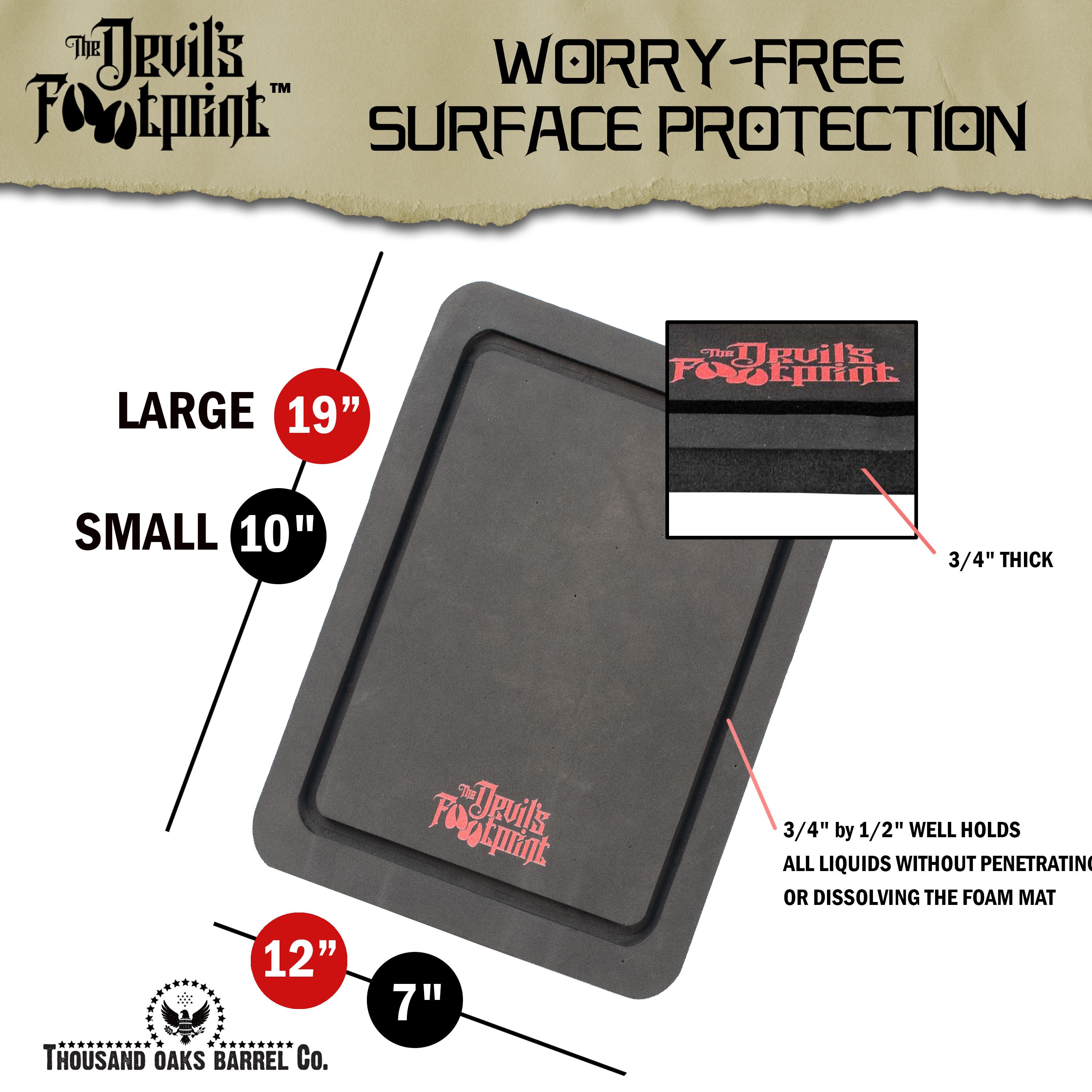 The Devil’s Footprint™ Barrel Mat prevents expensive surface damage by capturing every drop before it touches your counter.