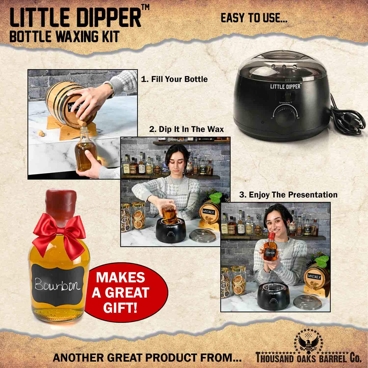 Whether you're sealing a homemade bourbon, aging whiskey in a mini barrel, bottling craft spirits, or creating custom gifts, the Little Dipper delivers clean, consistent, professional results every time.