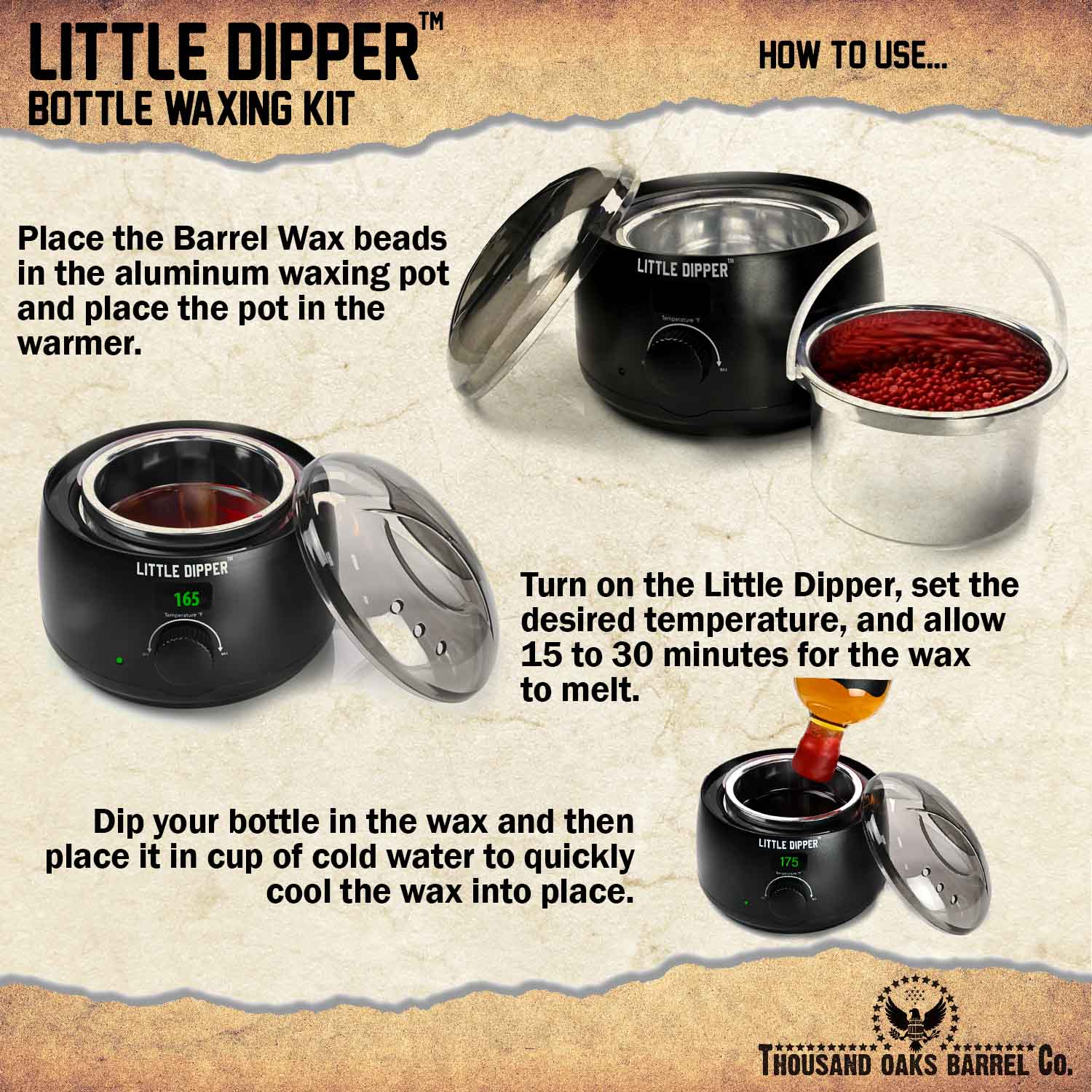 The Little Dipper™ Bottle Waxing Kit is the ultimate electric wax warmer system for creating professional, handcrafted bottle seals on whiskey, bourbon, wine, beer, maple syrup, vanilla extract, and craft spirits.